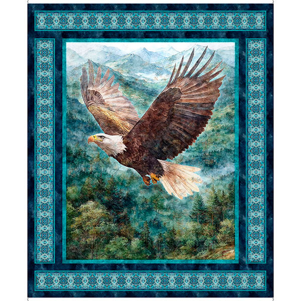 Soaring above a textured landscape of mountains and trees, the eagle embodies strength, resolve, and elegance. This iconic bird brings a breath of fresh air to your projects. Rendered in rich turquoise, royal blue, navy, tan, and accents of golden brown, these prints invite the outdoors in, inspiring you to look skyward and experience the flight of the eagle.© Morris Creative Group