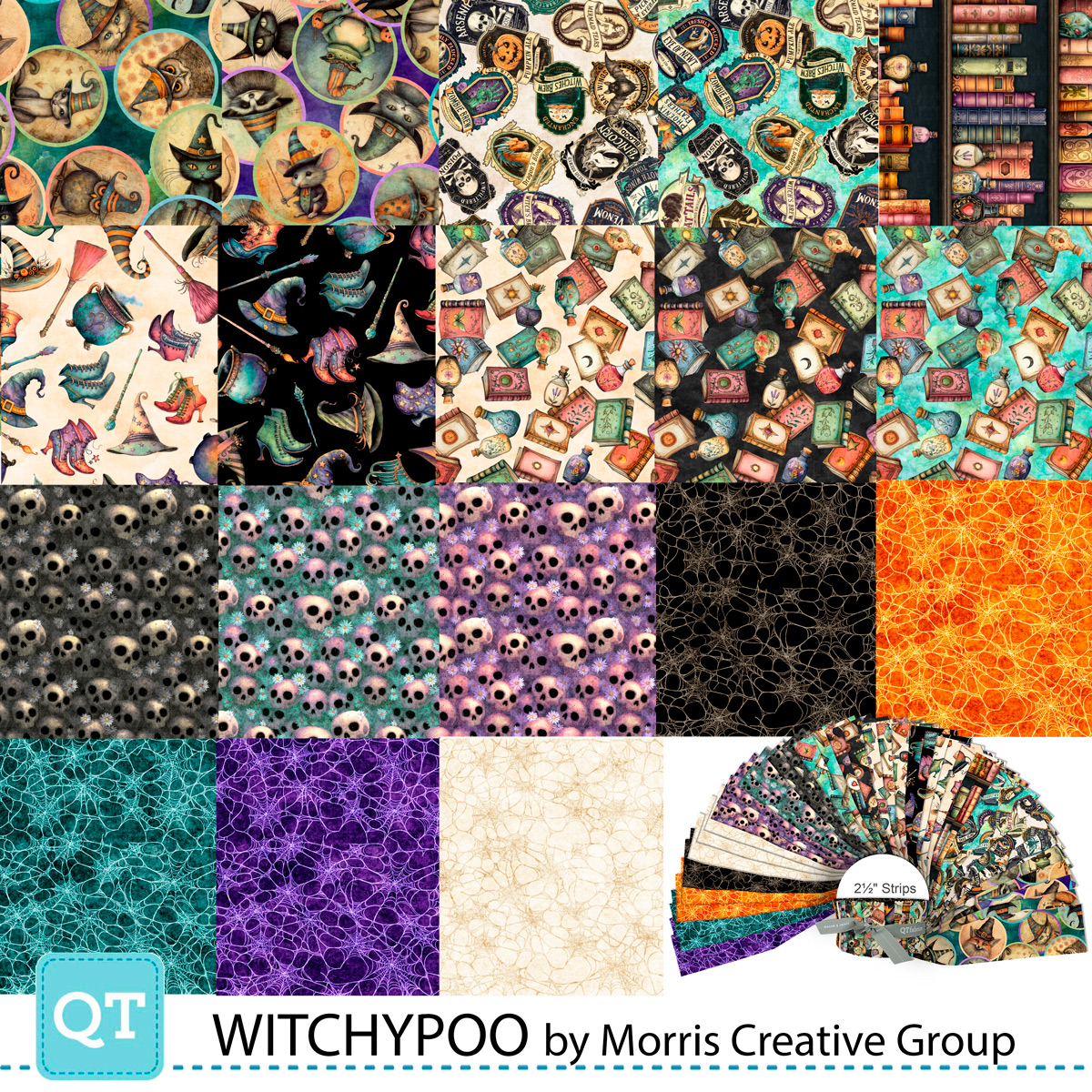 Cast a spell for your next enchanted project with this spirited collection! Joined by a menagerie of magical creatures, these witches bring the magic of Halloween to life! A dramatic haunted house panel sets the stage for coordinating prints filled with cobwebs, broomsticks, skulls, spell books and more. Vibrant colors add spooky energy to quilts, home décor, apparel – perfect for celebrating your favorite haunted holiday! © Morris Creative Group