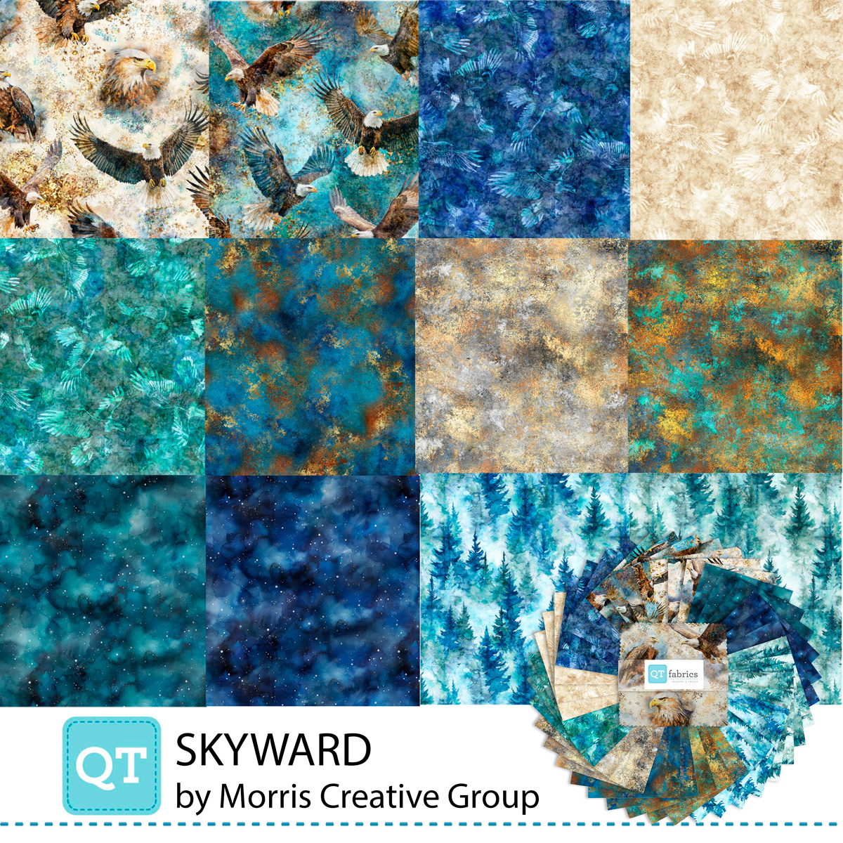 Soaring above a textured landscape of mountains and trees, the eagle embodies strength, resolve, and elegance. This iconic bird brings a breath of fresh air to your projects. Rendered in rich turquoise, royal blue, navy, tan, and accents of golden brown, these prints invite the outdoors in, inspiring you to look skyward and experience the flight of the eagle.© Morris Creative Group