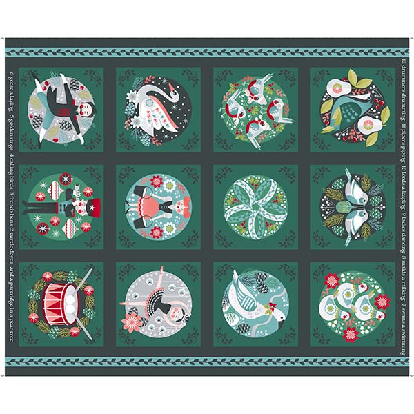 Contemporary Christmas is heading your way with this delightful collection of expressive designs starring all the characters of the 12 Days of Christmas. Lords-a-leaping, maids-a-milking, along with all-the-birds are represented in a beautiful color palette. Dark Turquoise, charcoal, aqua, joyful red, and gray with touches of lime green. With seven project panels, you have lots of chances for fast finishes to gift or keep for years to come! ©Julie Lynch