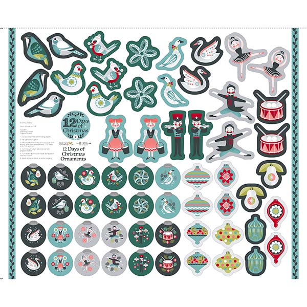 Contemporary Christmas is heading your way with this delightful collection of expressive designs starring all the characters of the 12 Days of Christmas. Lords-a-leaping, maids-a-milking, along with all-the-birds are represented in a beautiful color palette. Dark Turquoise, charcoal, aqua, joyful red, and gray with touches of lime green. With seven project panels, you have lots of chances for fast finishes to gift or keep for years to come! ©Julie Lynch