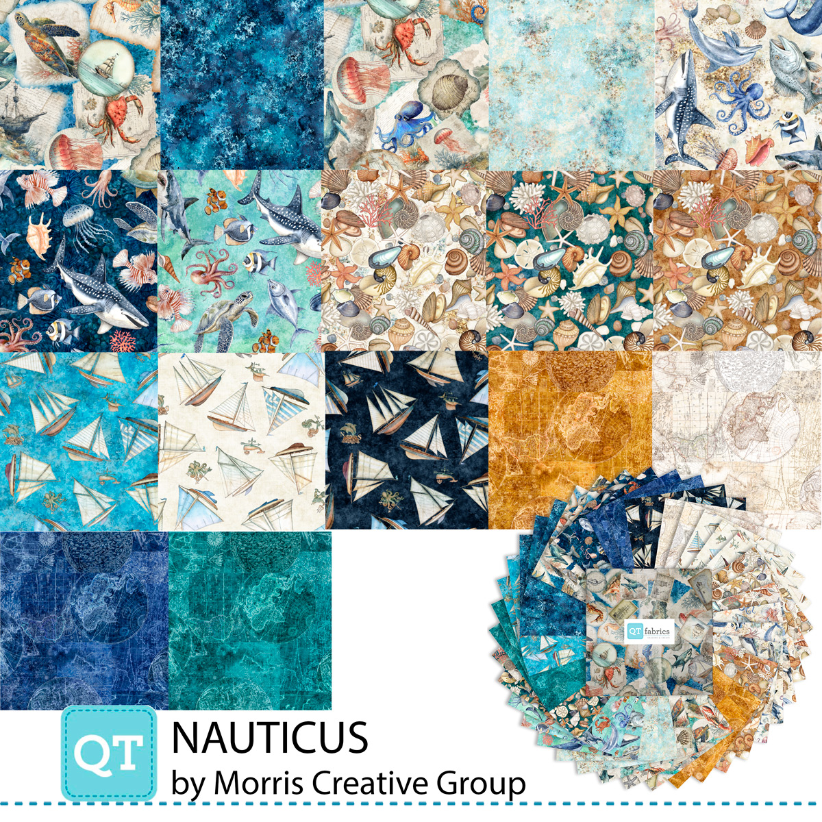 An array of ocean wonders depicted with vintage charm and textural beauty. Touches of historical maps with cartographer notes bring sophistication to this collection. Textural map illustrations, ships, seashells, and ocean creatures beautifully coordinate with a picture patch and large map panel. Set sail for an excellent quilting adventure. ©Morris Creative Group