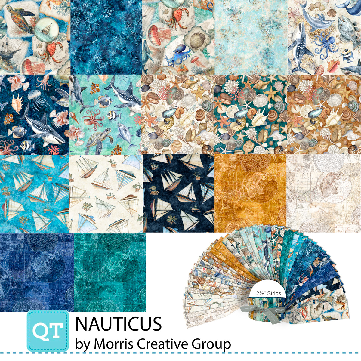 An array of ocean wonders depicted with vintage charm and textural beauty. Touches of historical maps with cartographer notes bring sophistication to this collection. Textural map illustrations, ships, seashells, and ocean creatures beautifully coordinate with a picture patch and large map panel. Set sail for an excellent quilting adventure. ©Morris Creative Group
