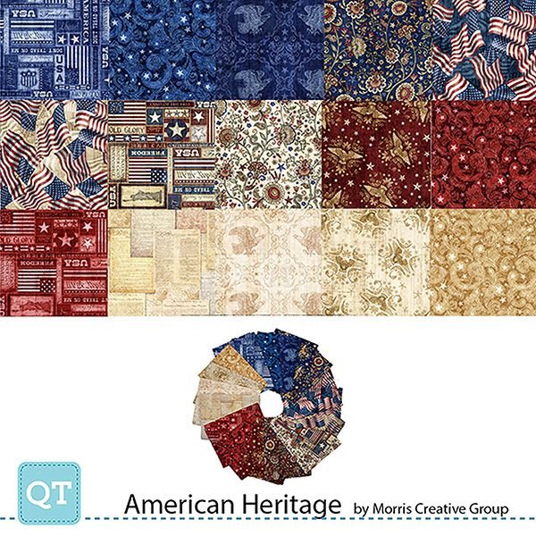 Sew your pride for the rich heritage of our great country and stitch something patriotic in rustic Americana style! A vintage-inspired flag panel, patriotic patches, eagles, wavy flags, and a generous array of floral and textural blenders will create projects our founding fathers would be proud of. Rich reds, classic blues, antique whites, with touches of gold and sepia evoke a timeless American spirit and provide a perfectly-aged look.