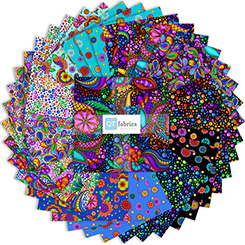 Bold and bright, uplifting and hypnotic, these prints combine for a dynamic collection in prismatic color. Accented with black, the color pops and the detailed artwork shines. These vivid fabrics are perfect for eye–catching quilts, accessories and home décor. © Debi Payne.