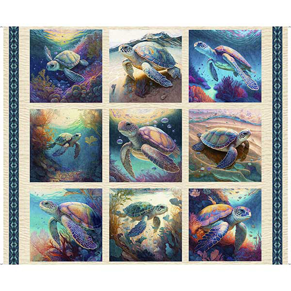 Sea turtles are rendered in their natural habitat in vibrant and rich varying ocean blues. A versatile assortment of design layouts offers endless creative uses. Sew projects that evoke a coastal flair and pay homage to these vulnerable wonders of nature. ©Morris Creative Group