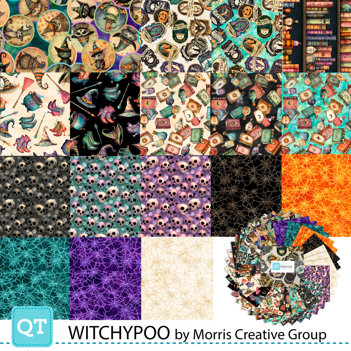 Cast a spell for your next enchanted project with this spirited collection! Joined by a menagerie of magical creatures, these witches bring the magic of Halloween to life! A dramatic haunted house panel sets the stage for coordinating prints filled with cobwebs, broomsticks, skulls, spell books and more. Vibrant colors add spooky energy to quilts, home décor, apparel – perfect for celebrating your favorite haunted holiday! © Morris Creative Group
