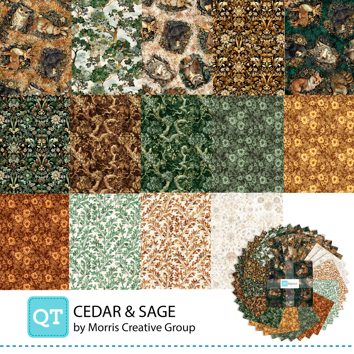 Striking detail and resplendent color creates a forest of prints alive with foliage and fauna. Woodland creatures emerge, inviting you to discover the beauty of nature. A majestic palette of forest green, umber, soft sage, amber, and taupe tones offer endless possibilities for quilts and home décor with timeless appeal.