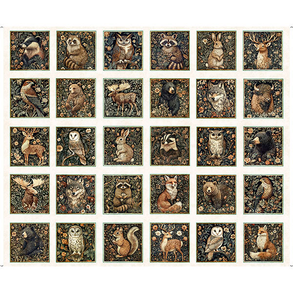 Striking detail and resplendent color creates a forest of prints alive with foliage and fauna. Woodland creatures emerge, inviting you to discover the beauty of nature. A majestic palette of forest green, umber, soft sage, amber, and taupe tones offer endless possibilities for quilts and home décor with timeless appeal.