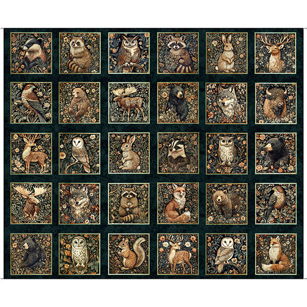 Striking detail and resplendent color creates a forest of prints alive with foliage and fauna. Woodland creatures emerge, inviting you to discover the beauty of nature. A majestic palette of forest green, umber, soft sage, amber, and taupe tones offer endless possibilities for quilts and home décor with timeless appeal.