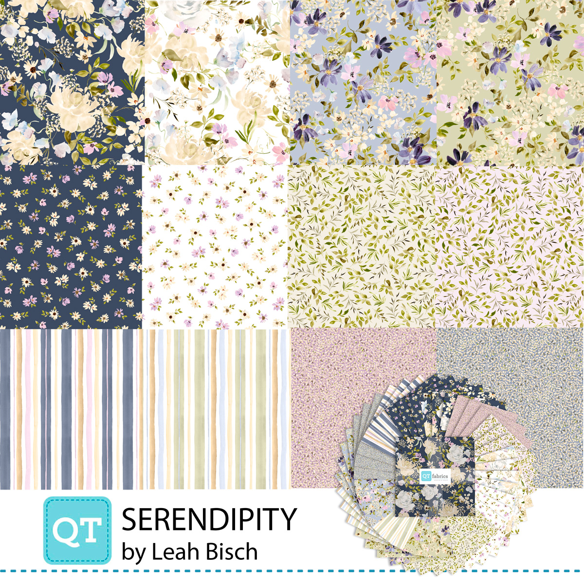 Contemporary elegance awaits your next project. This garden-inspired collection features gentle watercolor blushing blooms, dancing leaves and delicate sprigs in an ethereal palette. Subdued navy, periwinkle, ballet pink, soft sage, and crisp white are perfect for creating quilts, apparel, accessories, and more. ©Leah Bisch