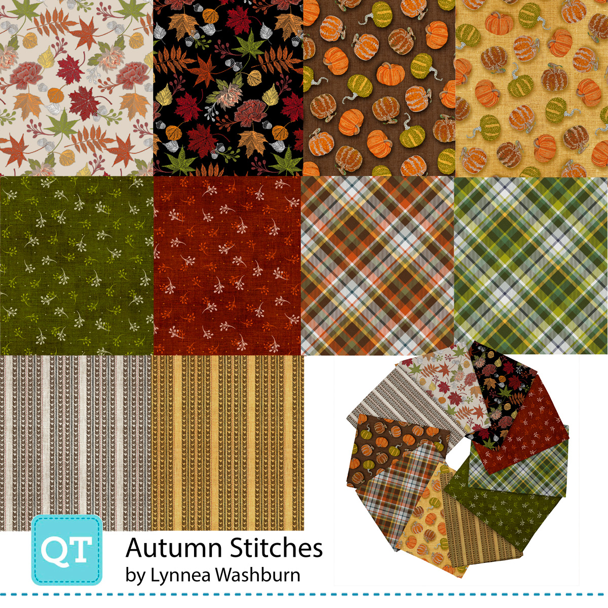 Embroidered fall motifs in striking seasonal colors come together in intricate detail, perfect for cozy home décor and more. A 60” wide double border on canvas is perfect to set the tablescape of your dreams. Paired with gorgeous plaids, stitched pumpkins, falling leaves, and woven-inspired textures, this collection offers a true cornucopia of creativity. ©Lynnea Washburn