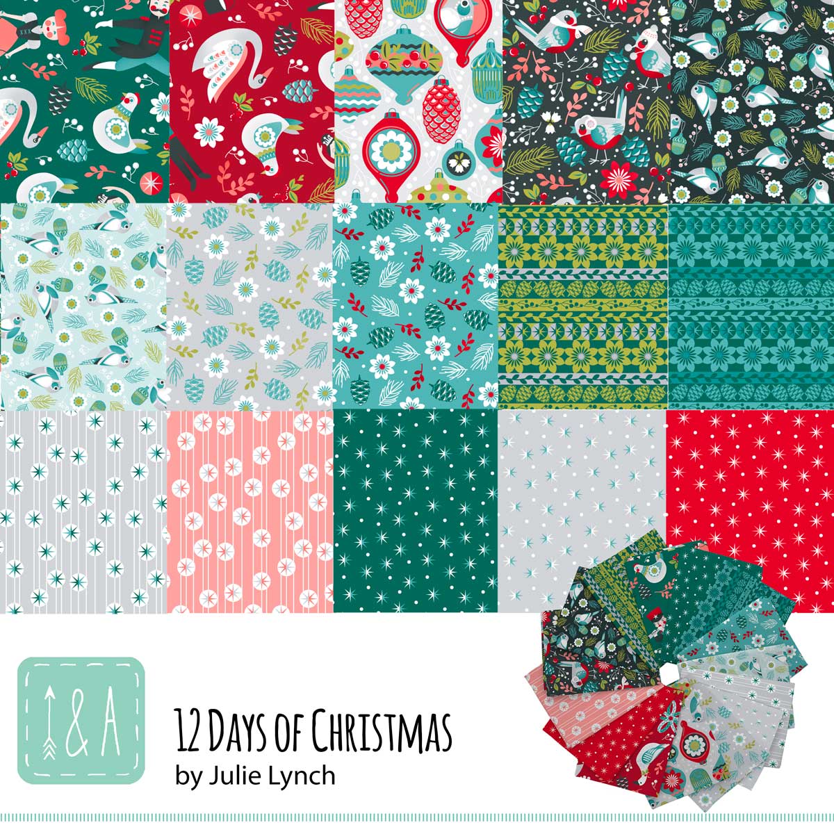 Contemporary Christmas is heading your way with this delightful collection of expressive designs starring all the characters of the 12 Days of Christmas. Lords-a-leaping, maids-a-milking, along with all-the-birds are represented in a beautiful color palette. Dark Turquoise, charcoal, aqua, joyful red, and gray with touches of lime green. With seven project panels, you have lots of chances for fast finishes to gift or keep for years to come! ©Julie Lynch